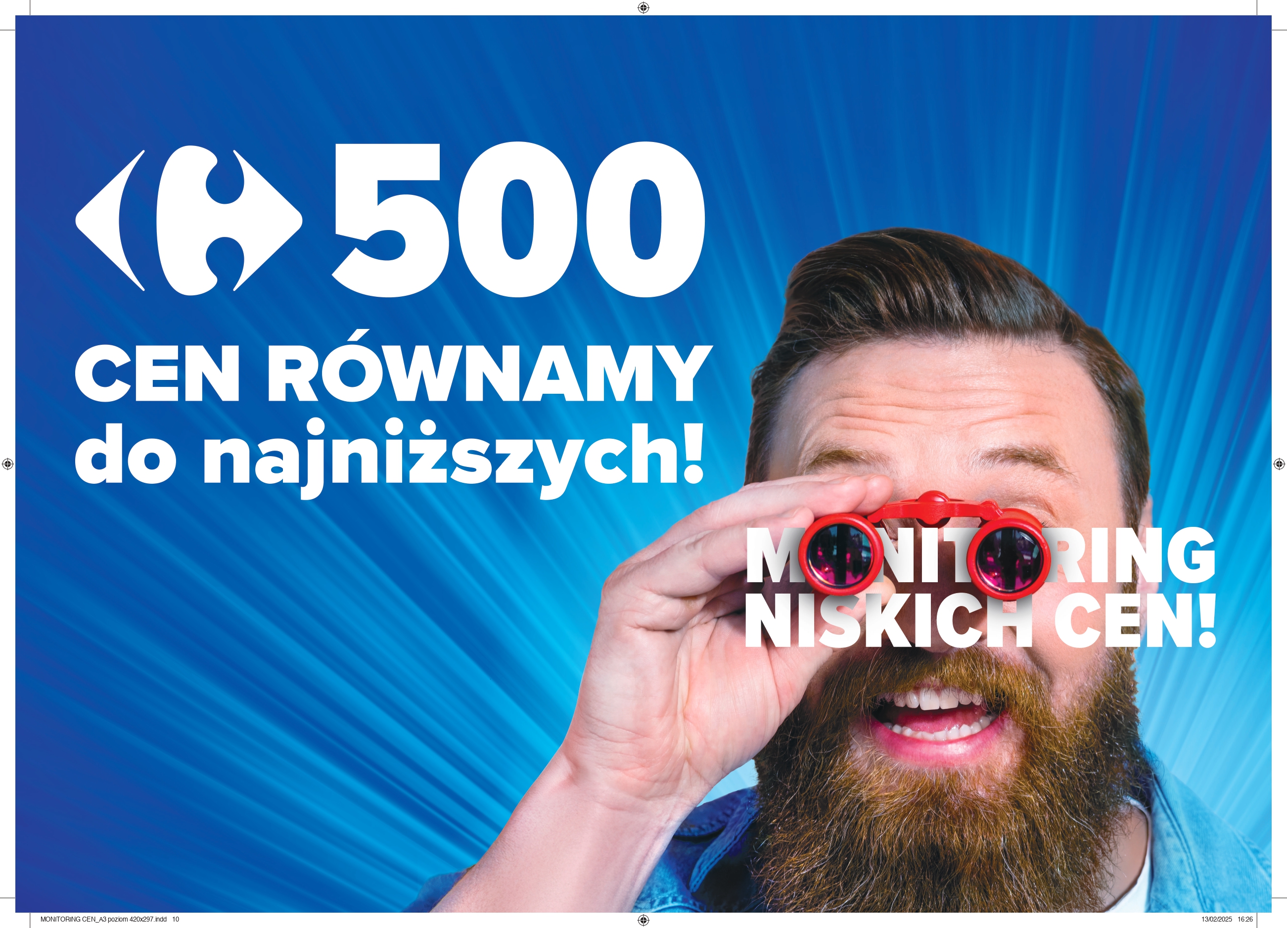 W dzisiejszych czasach cena jest bardzo ważnym driverem zakupowym. Jednocześnie konsumenci nie chcą rezygnować z możliwości wyboru podczas zakupów. Szeroko zasięgowa kampania informuje, że sieć Carrefour wyrównuje 500 cen codziennych produktów do poziomu najniższych na rynku, dzięki czemu konsument ma pewność zakupów w dobrej cenie i możliwość korzystania z szerokiej oferty produktowej sieci. Jest to możliwe dzięki monitoringowi cen prowadzonemu regularnie w całej Polsce, który obejmuje zarówno produkty brandowe, jak i marki własnej.